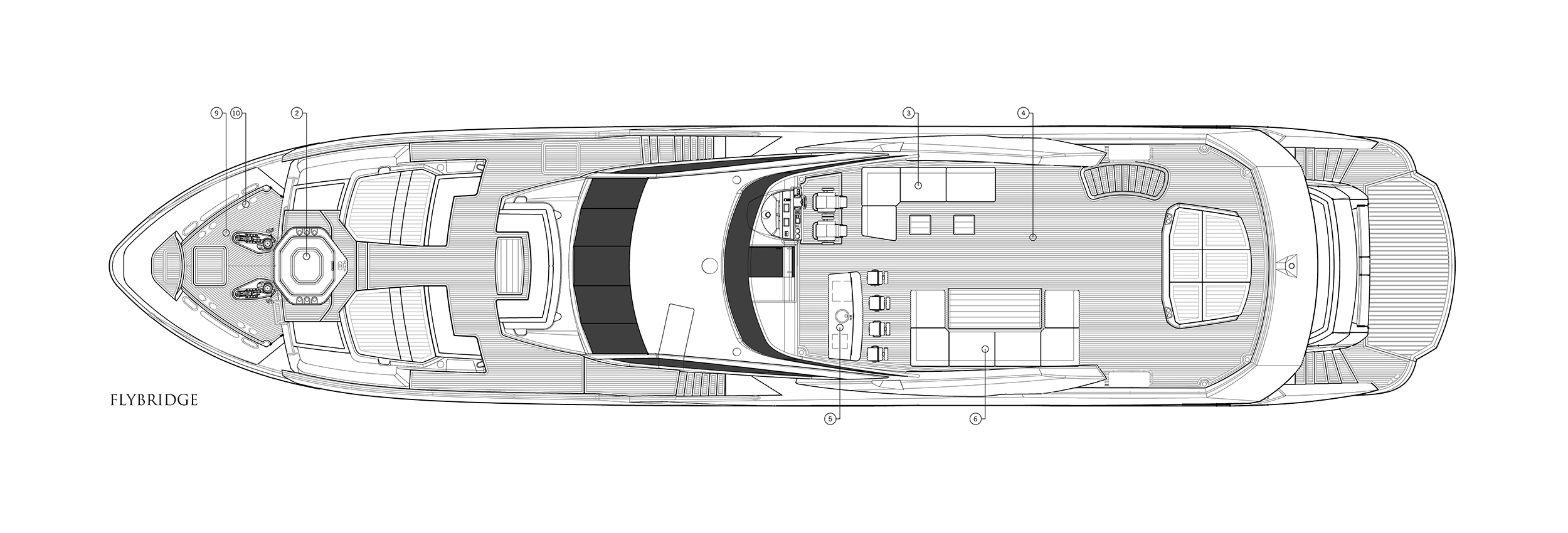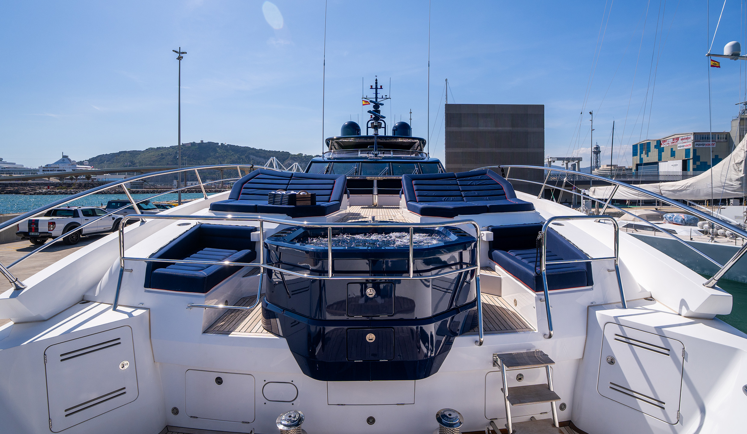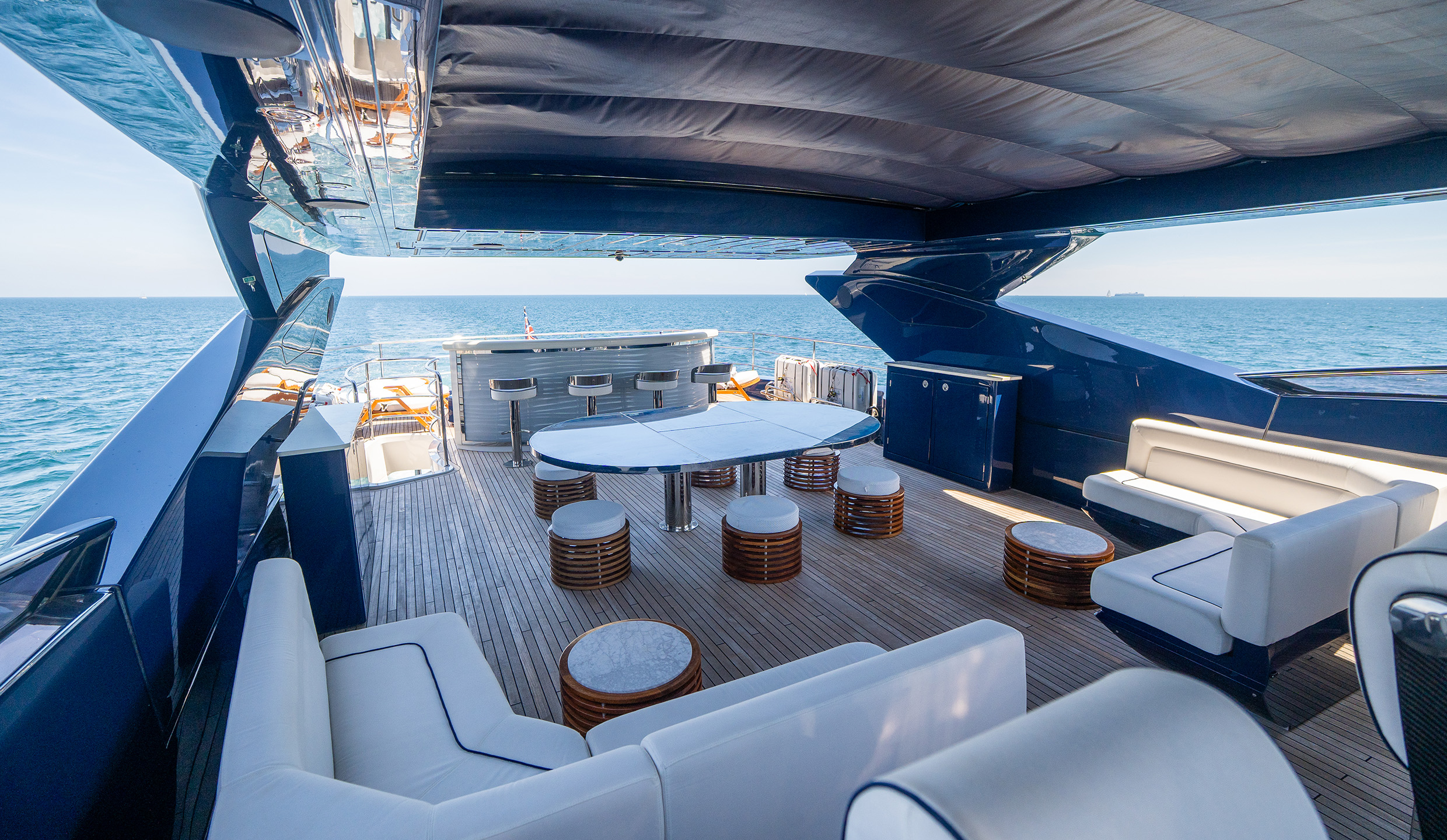The expansive deck spaces include a Foredeck Jacuzzi, a fully equipped bar on the Flybridge, and ample lounging areas in all parts of the yacht for relaxation or entertaining.