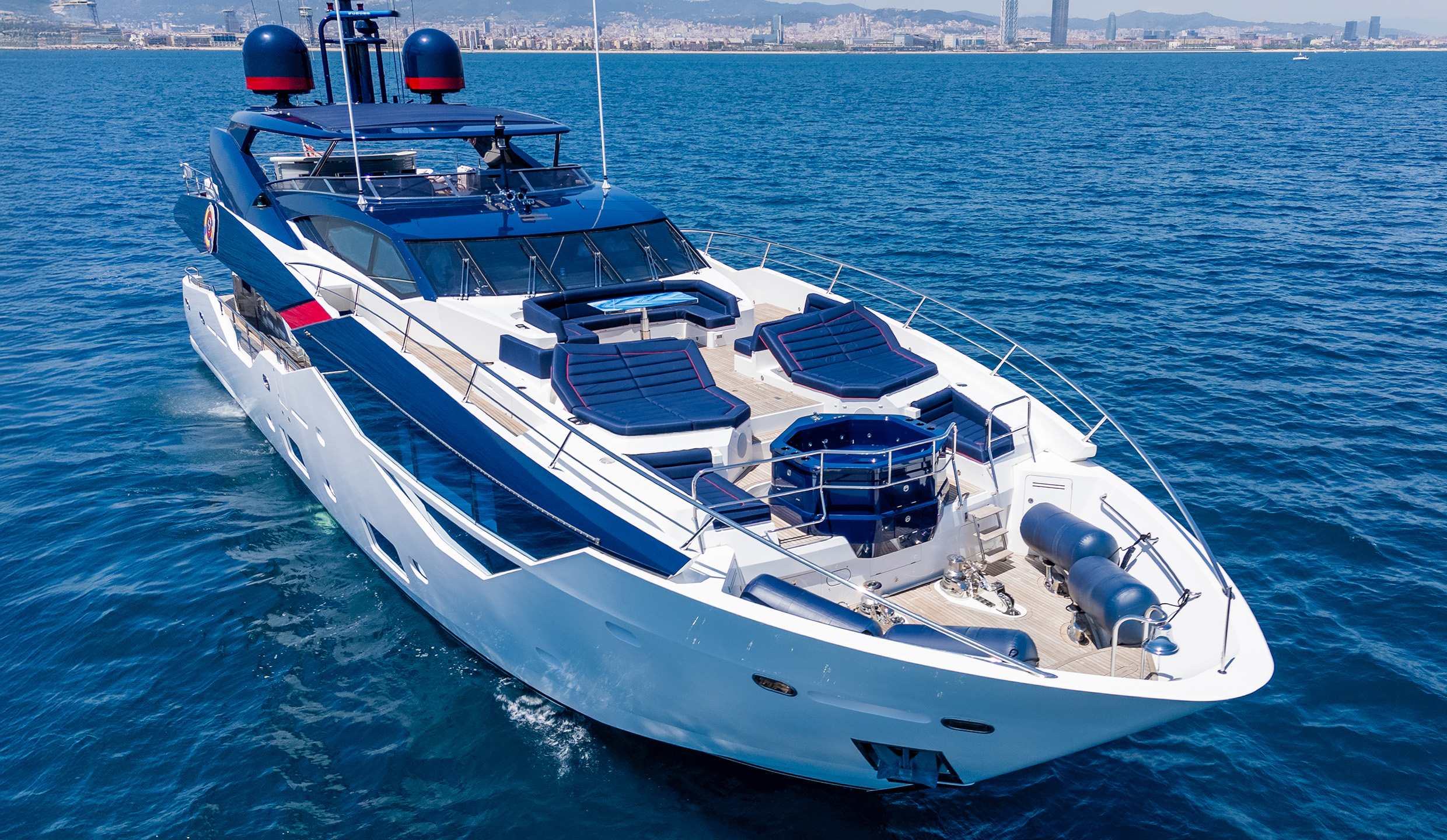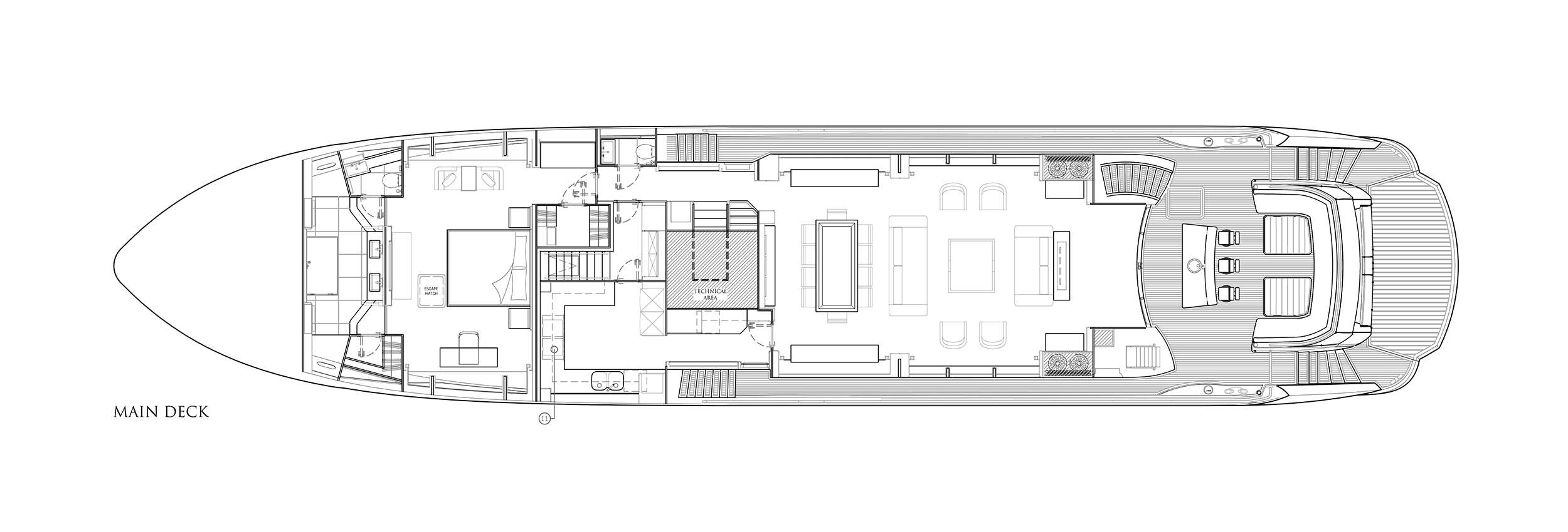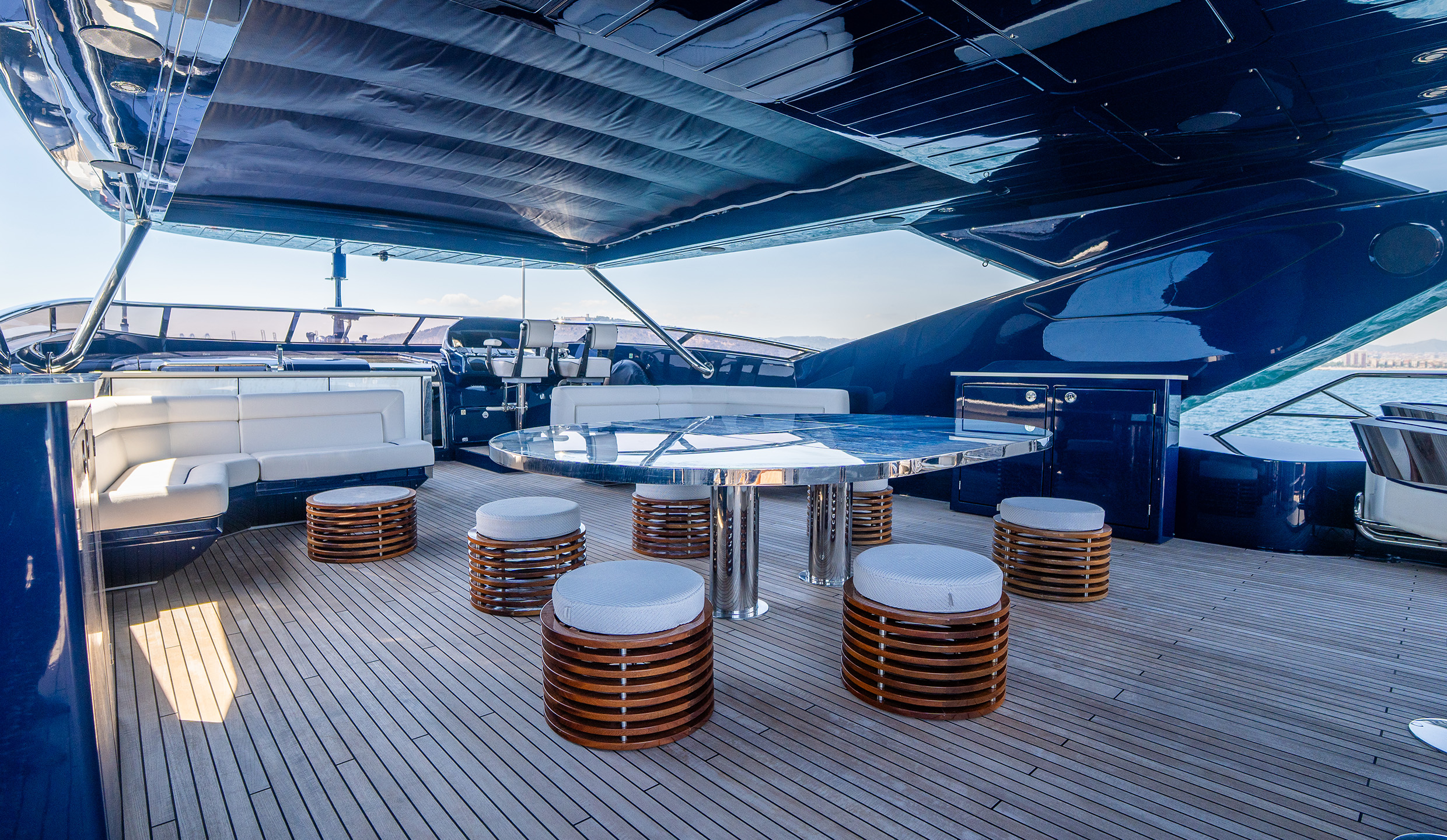 The expansive deck spaces include a Foredeck Jacuzzi, a fully equipped bar on the Flybridge, and ample lounging areas in all parts of the yacht for relaxation or entertaining.