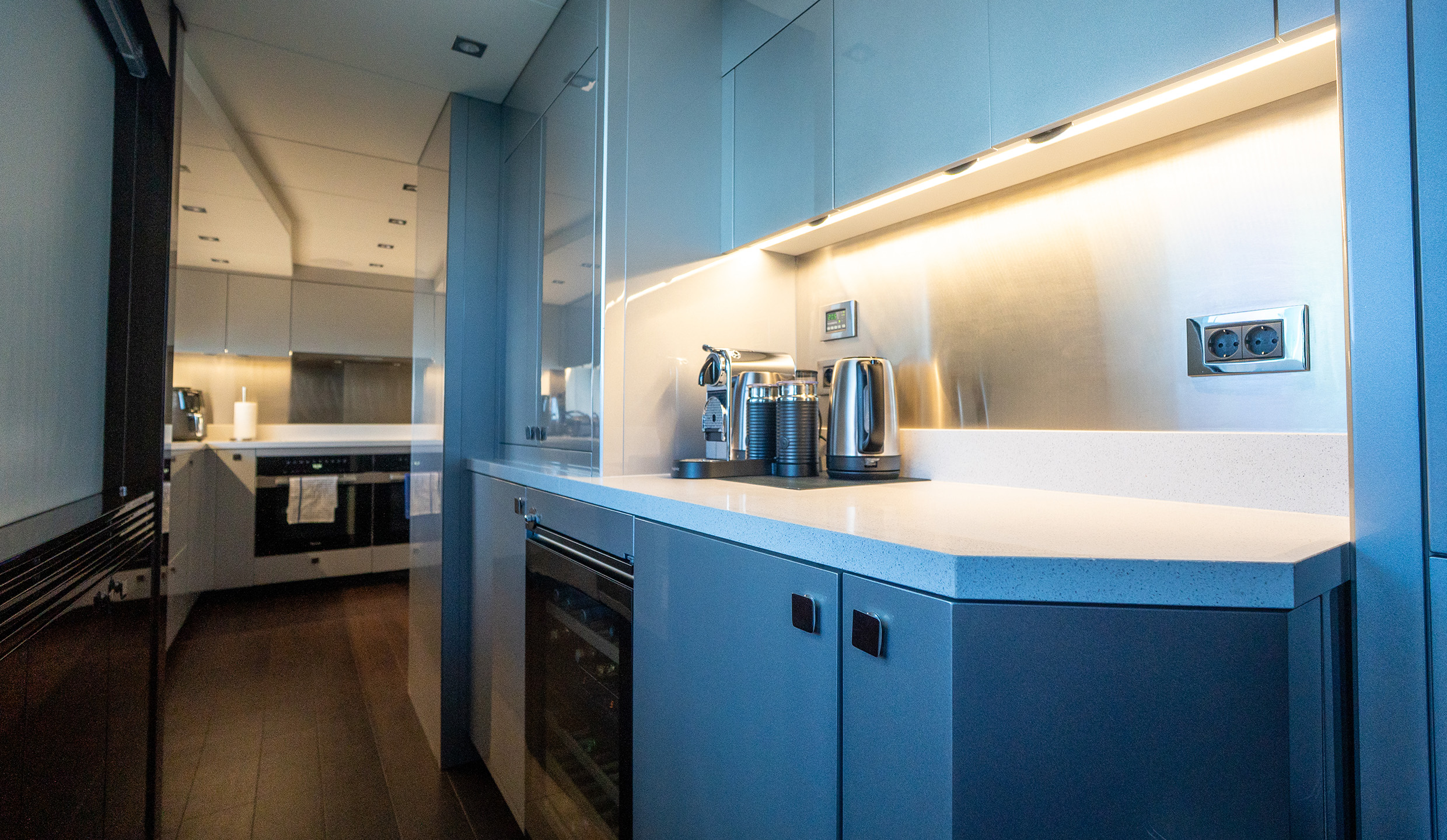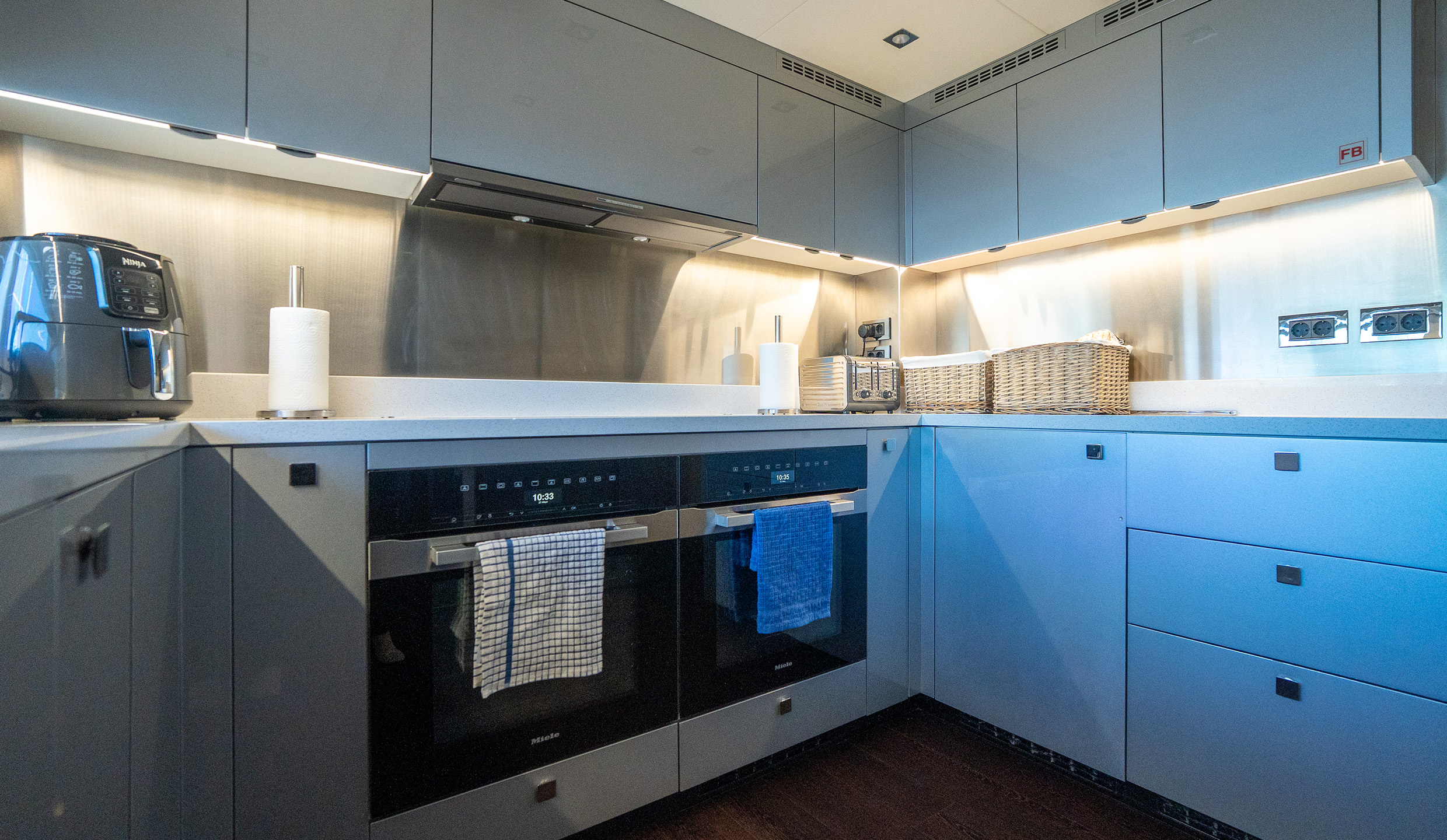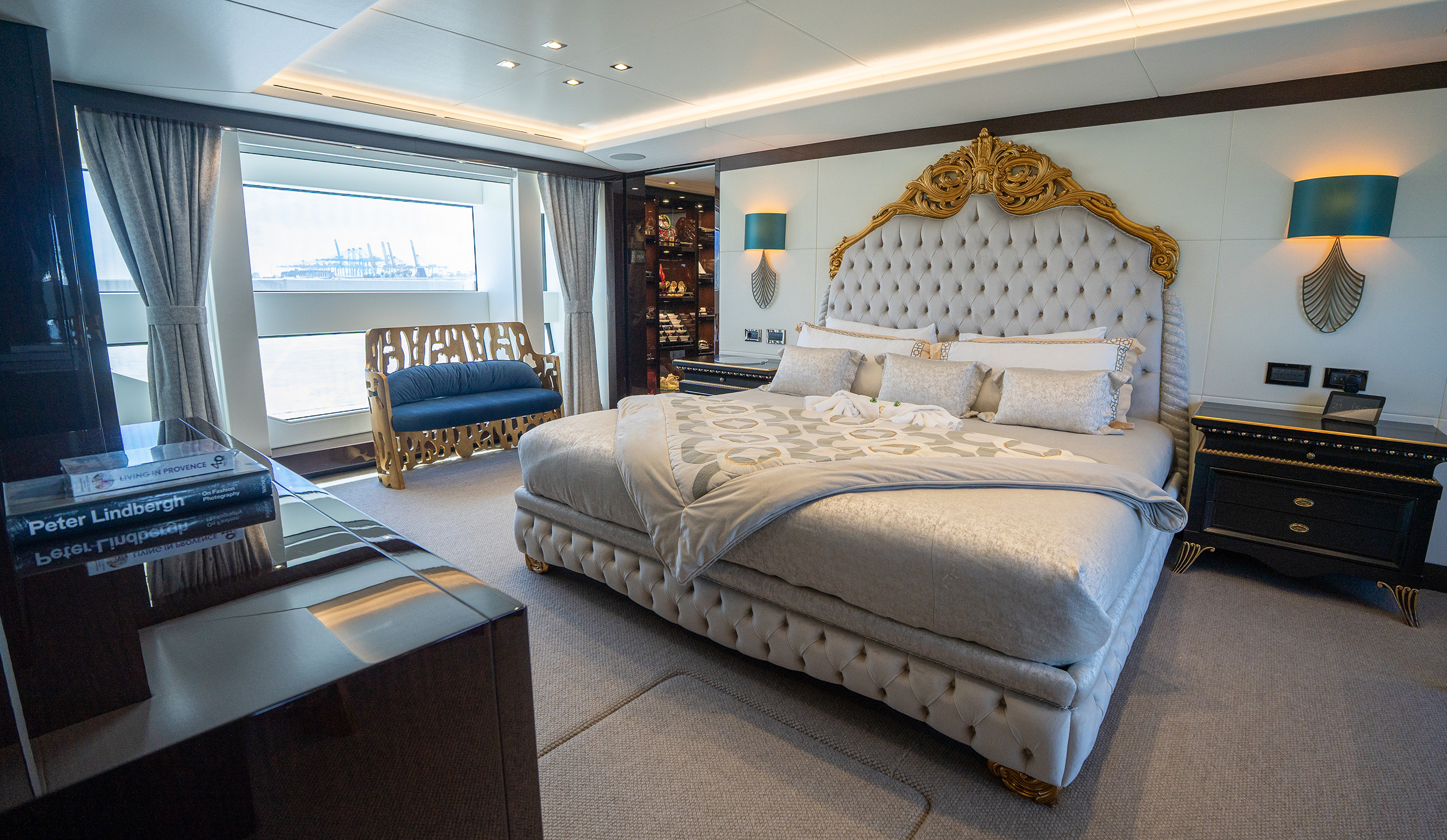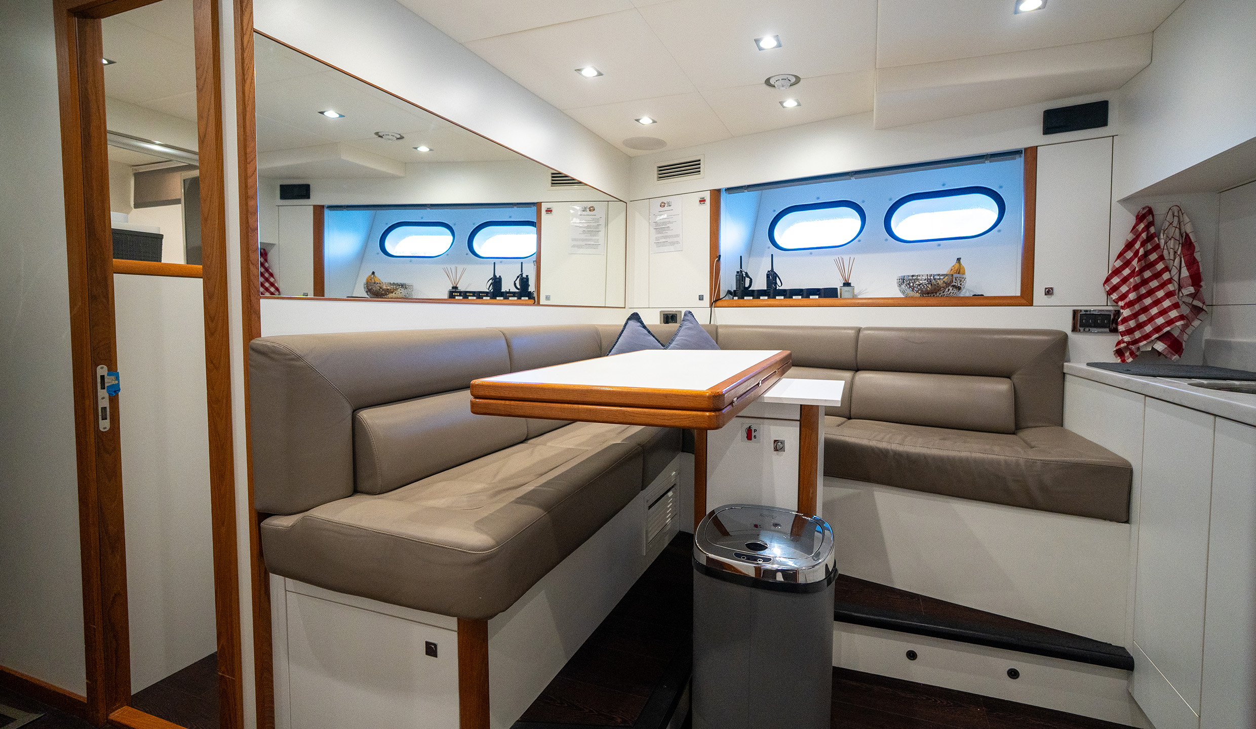 These cabins are thoughtfully designed with meticulous attention to detail, offering a harmonious blend of style and functionality. Whether hosting family or friends, “Out of the Blue” provides a serene and sophisticated retreat for all aboard.