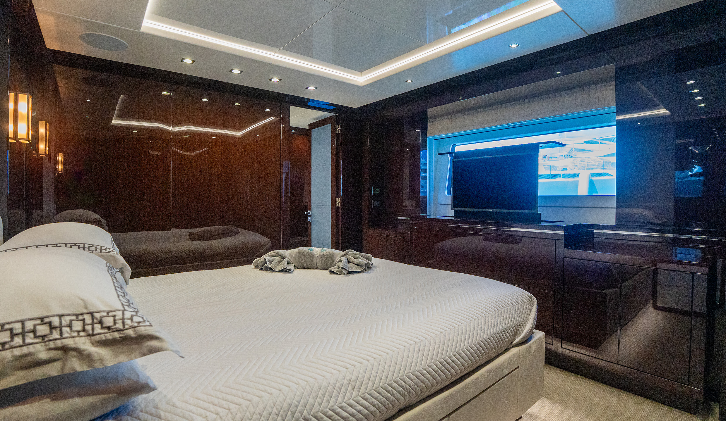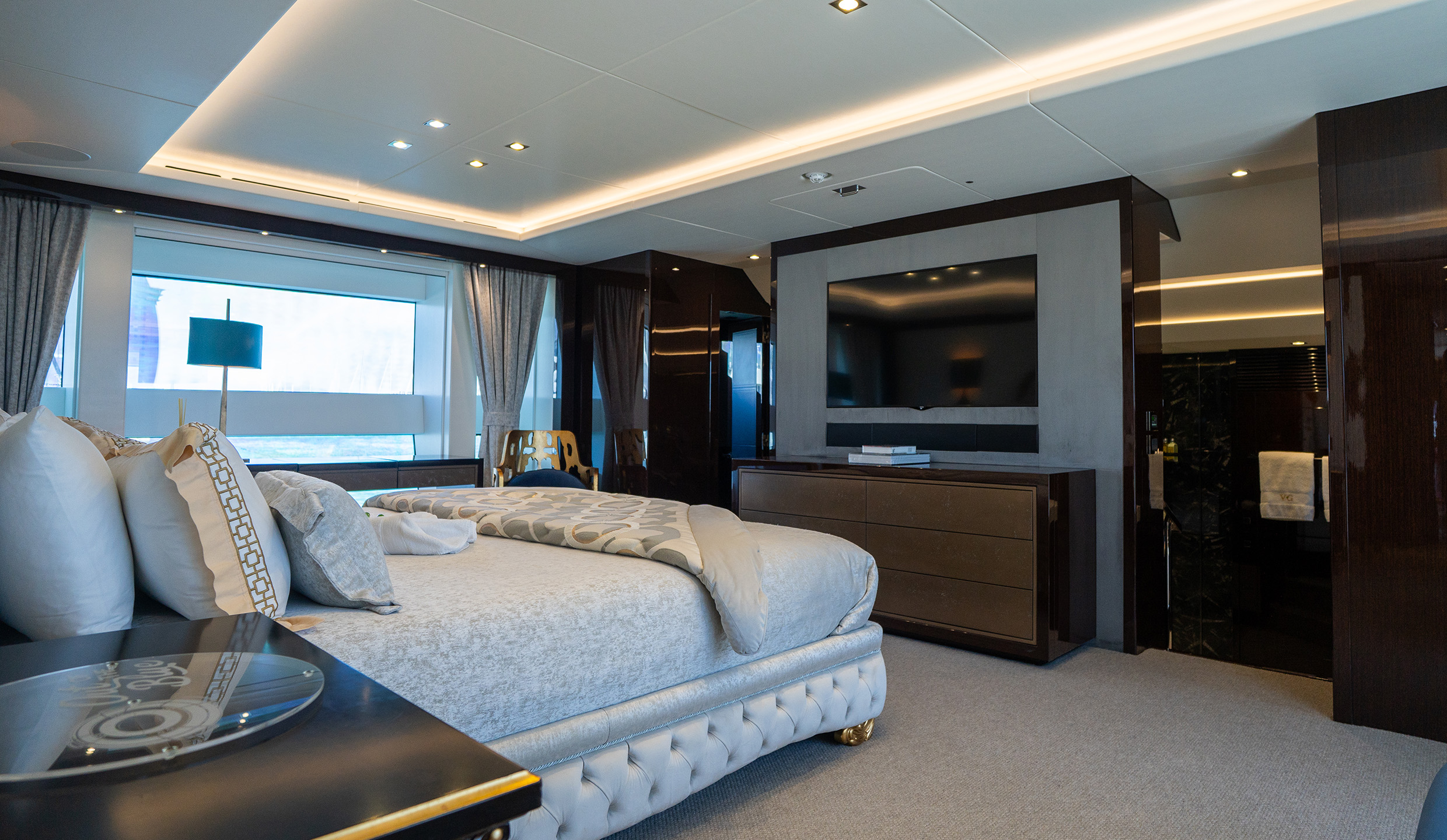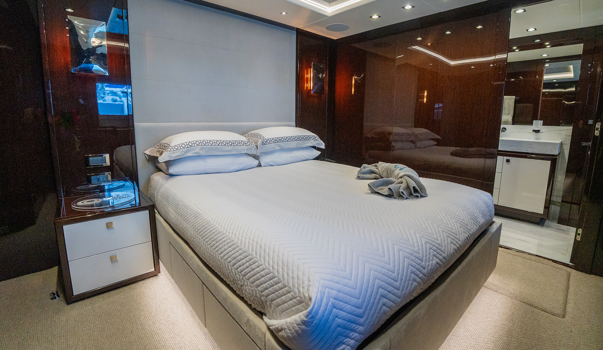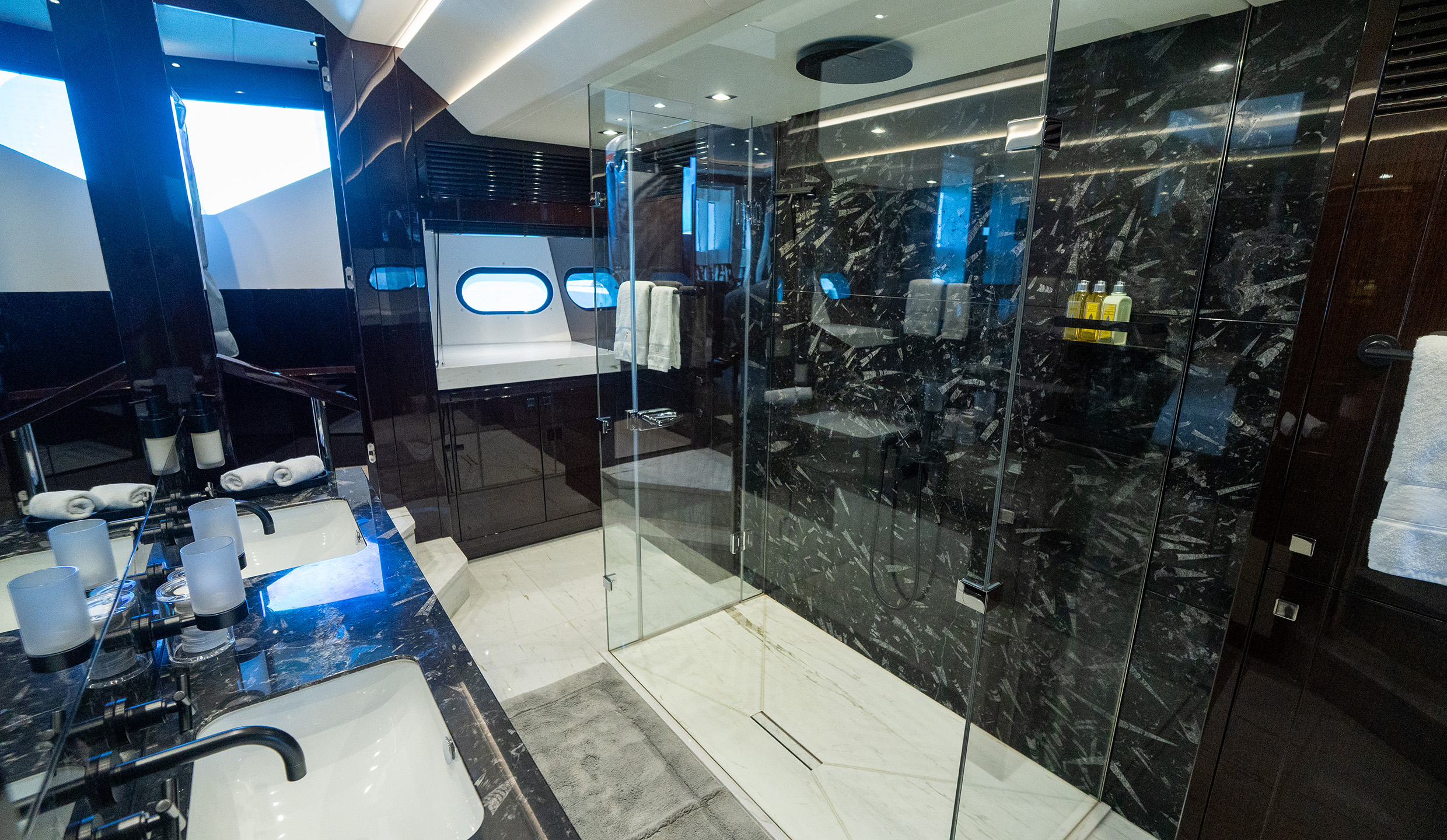 The Sunseeker 116 Yacht “Out of the Blue” offers luxurious accommodations designed for ultimate comfort and privacy. At the heart of the yacht is the expansive full-beam master cabin, a true sanctuary featuring elegant design, ample space, and a lavish en-suite bathroom. This beautifully appointed bathroom boasts twin sinks and premium finishes, exuding a spa-like ambiance.