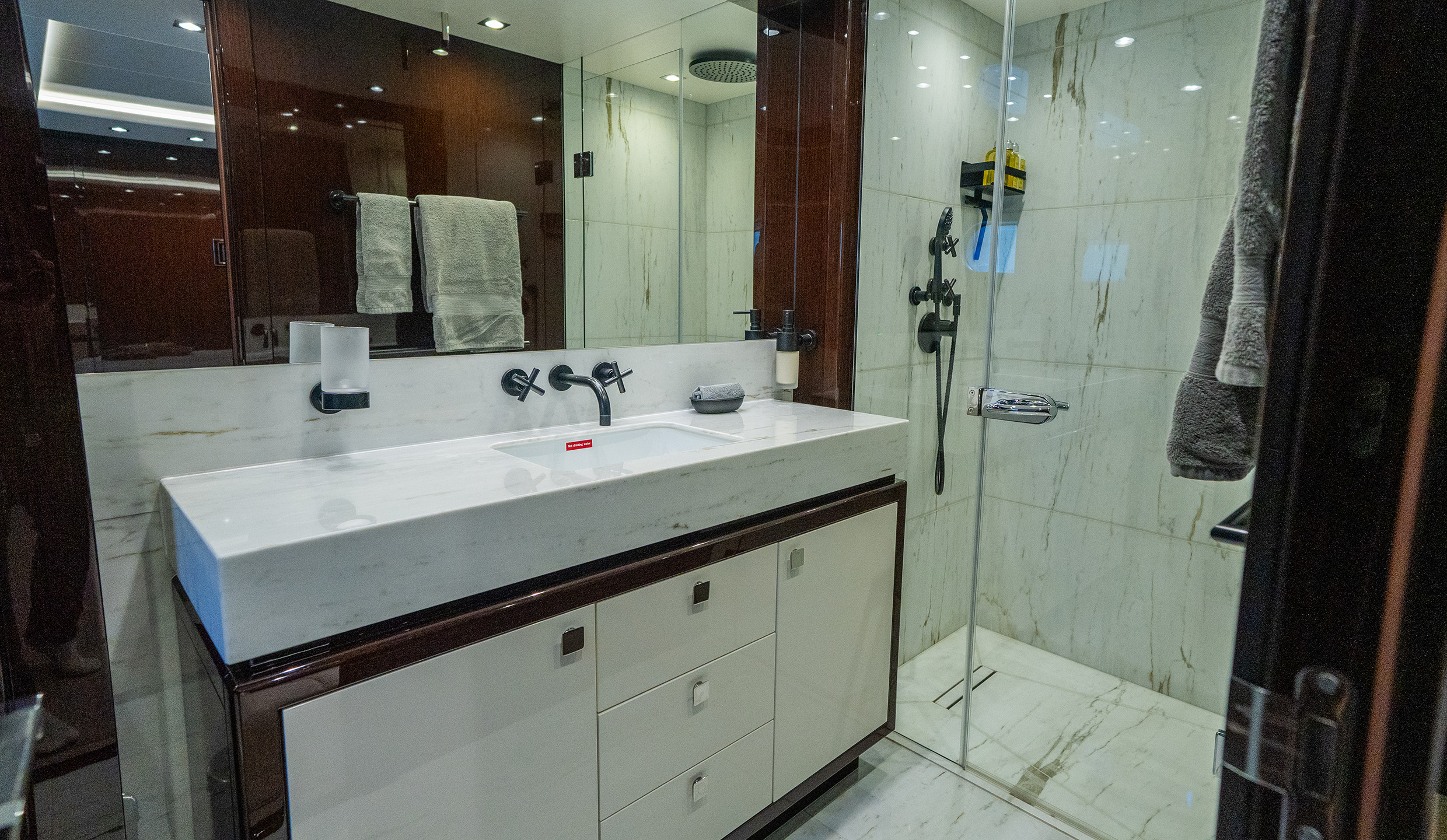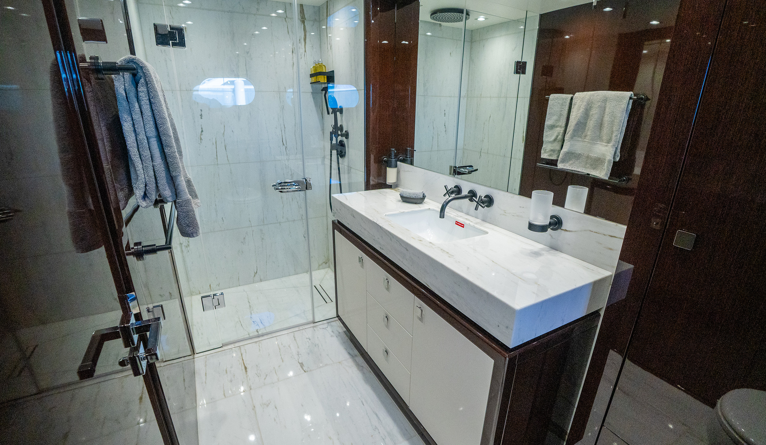 - Lower deck Guest Cabin Bathroom stone aft cabins (Doubles) in Calacatta