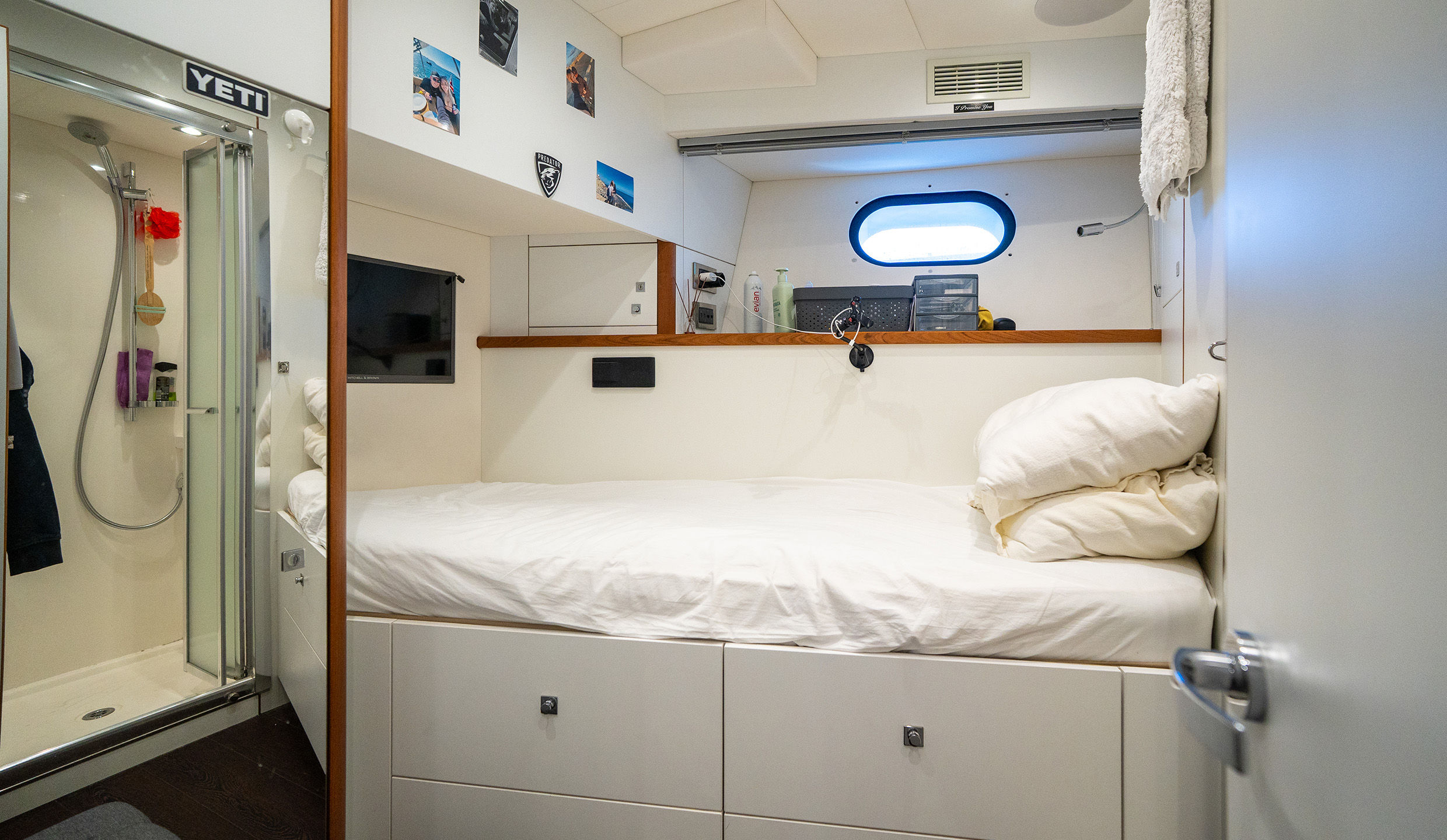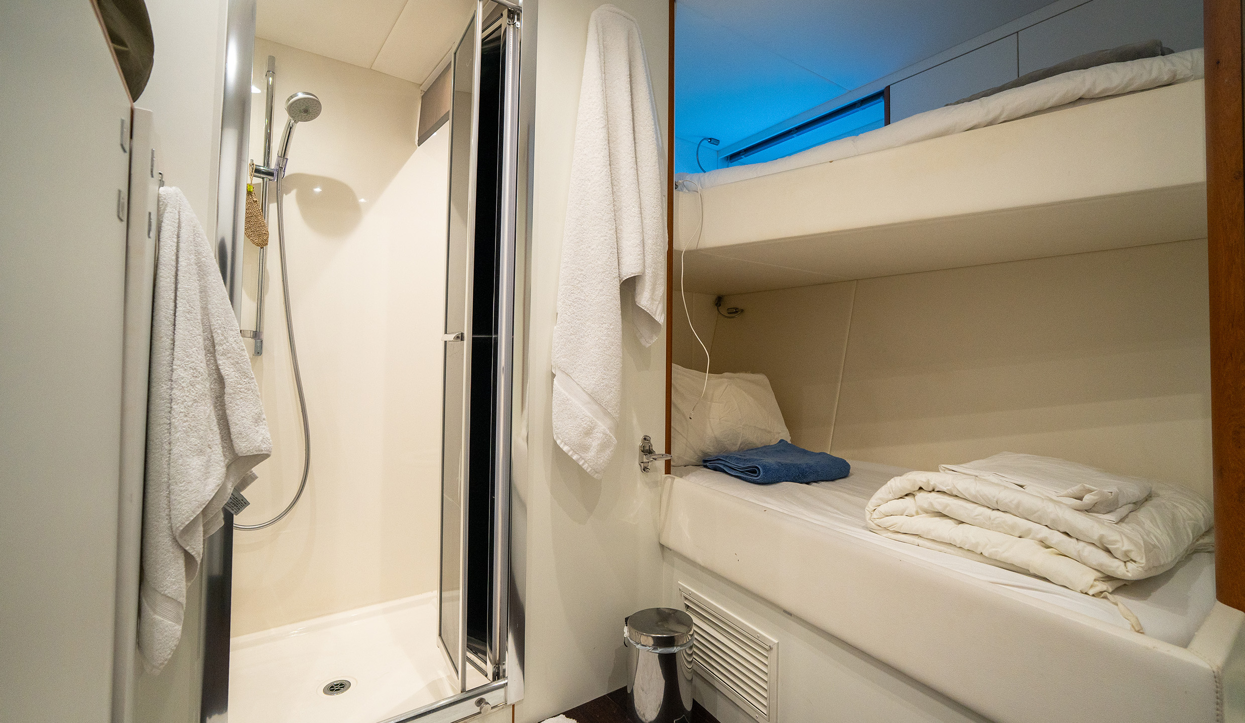 Guests are equally well-accommodated in two spacious double cabins each with its own private en-suite bathroom. There are two versatile twin cabins, one setup with twin beds and the other setup as bunks where the room also doubles up as an office. Both rooms again have its own en-suite bathroom.
